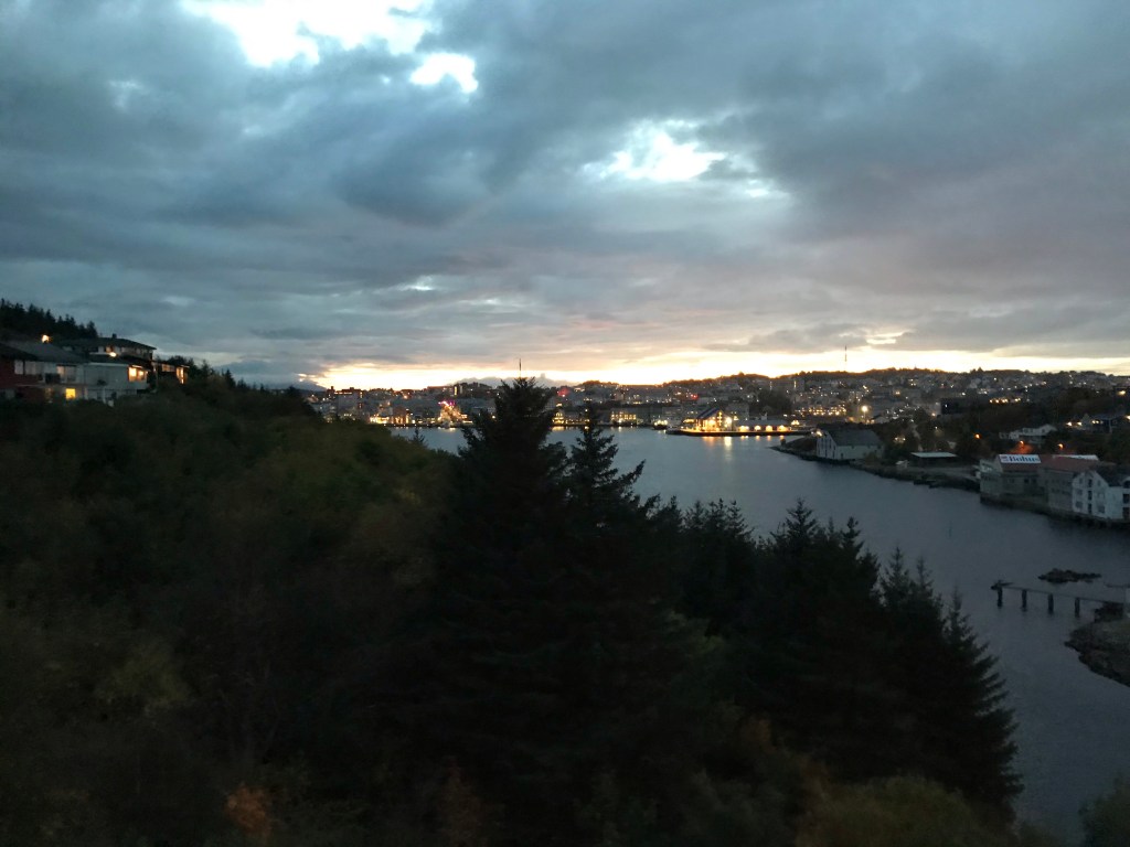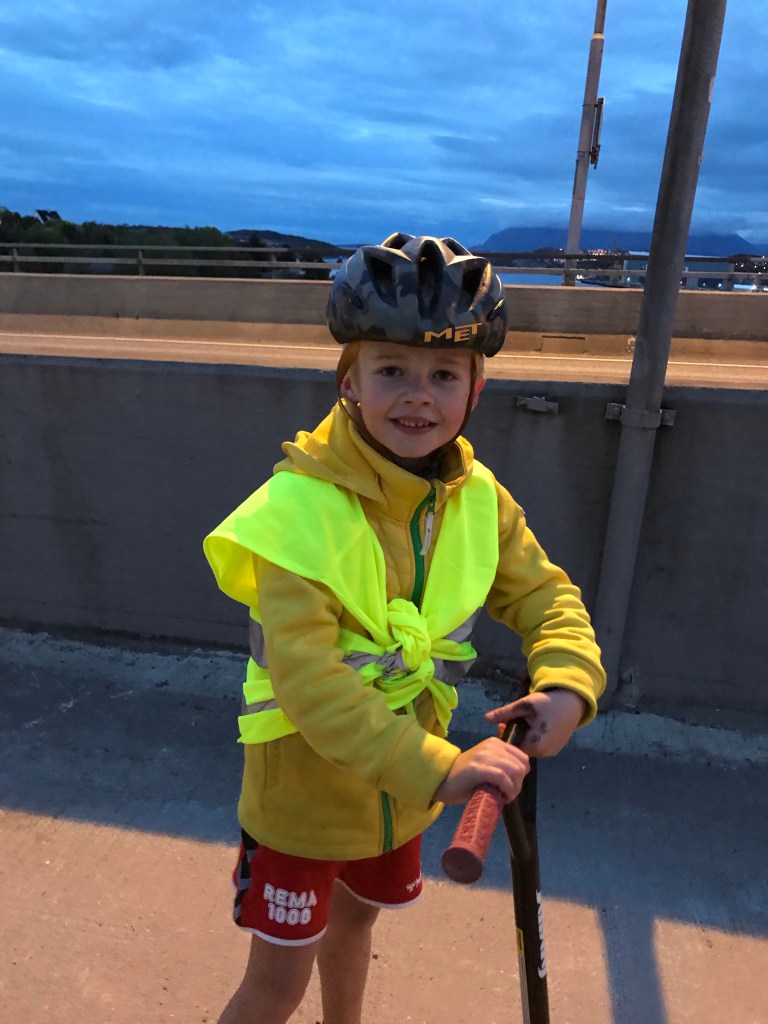 I går eftermiddags var Kenth kørt ind til centrum med alle ungerne, og jeg cyklede derind direkte efter arbejde. Vi fandt et indkøbscenter vi ikke havde opdaget før, så nu er der basis for mere shopping på regnvejrsdage😉 Vi spiste aftensmad på en café i centrum, og da vi skulle hjemad – Kenth og drengene i bilen, mig på cyklen – ville altid aktive Jakob selvfølgelig gerne med mig i stedet…på løbehjul, 5-6 km hjemmefra! Det er helt vildt som den dreng har en ufattelig lyst til at bruge kroppen og være aktiv hele tiden. Jeg tror han går omtrent dobbelt så langt som os andre når vi er afsted, fordi han springer frem og tilbage, op og ned. Det var en fin aften med godt vejr – og dertil en helt fantastisk solnedgang over Kristiansund – så han fik lov. 50 minutters tur på løbehjul med en hel del bakker – uden brok, men bare glæde over at få lov. Jeg synes det er ret imponerende. Det er også skønt at have tiden sammen, (næsten) bare os to. Thomas kom bag på min cykel, men eftersom han godt kan li’ at sidde der hørte vi stort set ikke en lyd fra ham hele turen😉