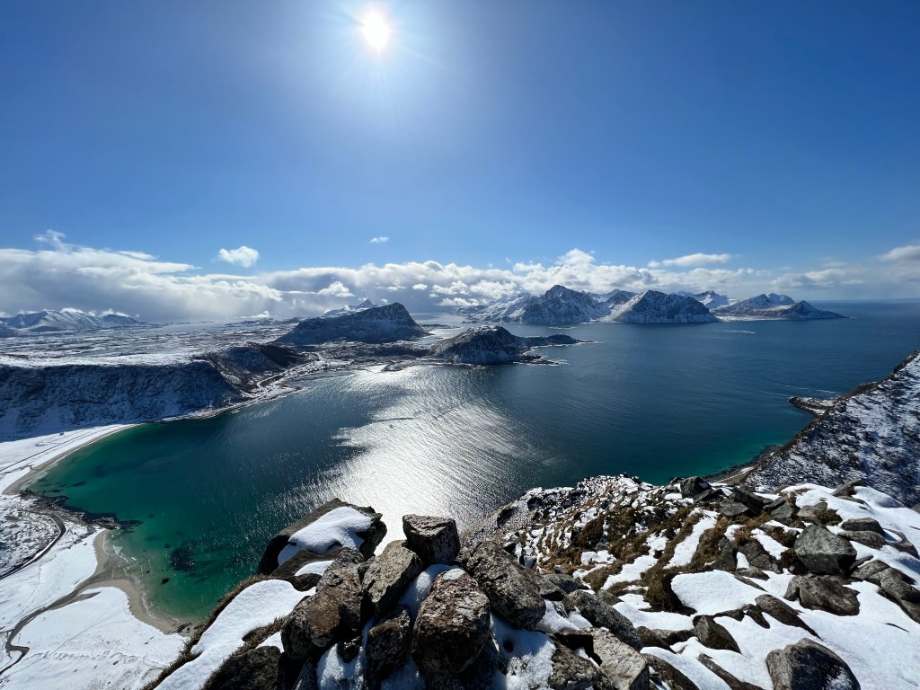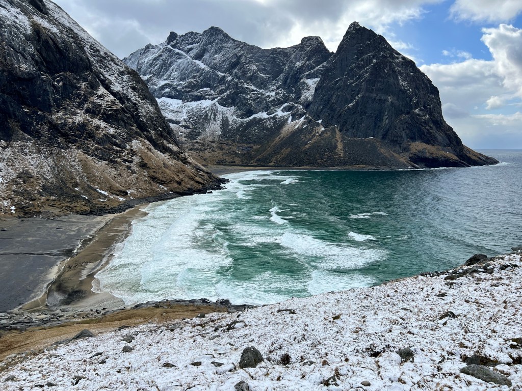 Min eneste weekend heroppe lakker nu mod enden. Jeg har været på tur både fredag, lørdag og søndag, og har været godt rundt i Lofoten. Vejret har været enormt skiftende, men heldigvis mest godt både lørdag og søndag. Fredag var regn på regn og overskyet, så der blev det meste af tiden brugt i bilen. -Selv i dårligt vejr er der dog utroligt smukt i Lofoten. I morges vågnede jeg op til 10cm sne på bilerne og solskin. I dag har budt på klart det flotteste vejr, dog ikke uden haglbyer indimellem. Har jeg lært noget her i Lofoten er det dog, at man bare skal vente 10 minutter, så kan der være blå himmel og solskin.