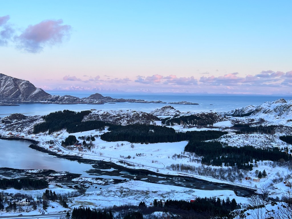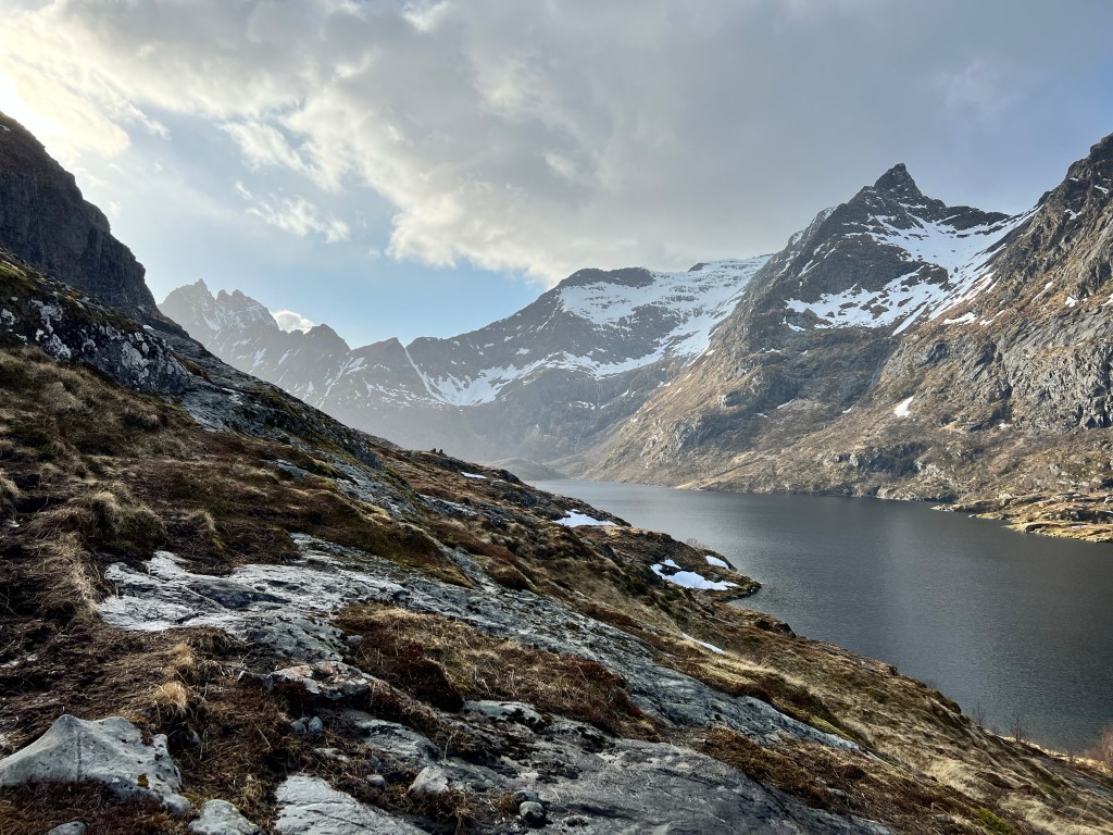 De fleste steder jeg har været med fjelde og bjerge går der indimellem veje op på fjeldet. Det gør der ikke her i Lofoten – i hvert fald ikke nogen jeg har opdaget endnu. Alle vejene er ved foden af fjeldene, så vil man op, må man gå. -Det er der til gengæld rig mulighed for hvor end man vender sig hen!