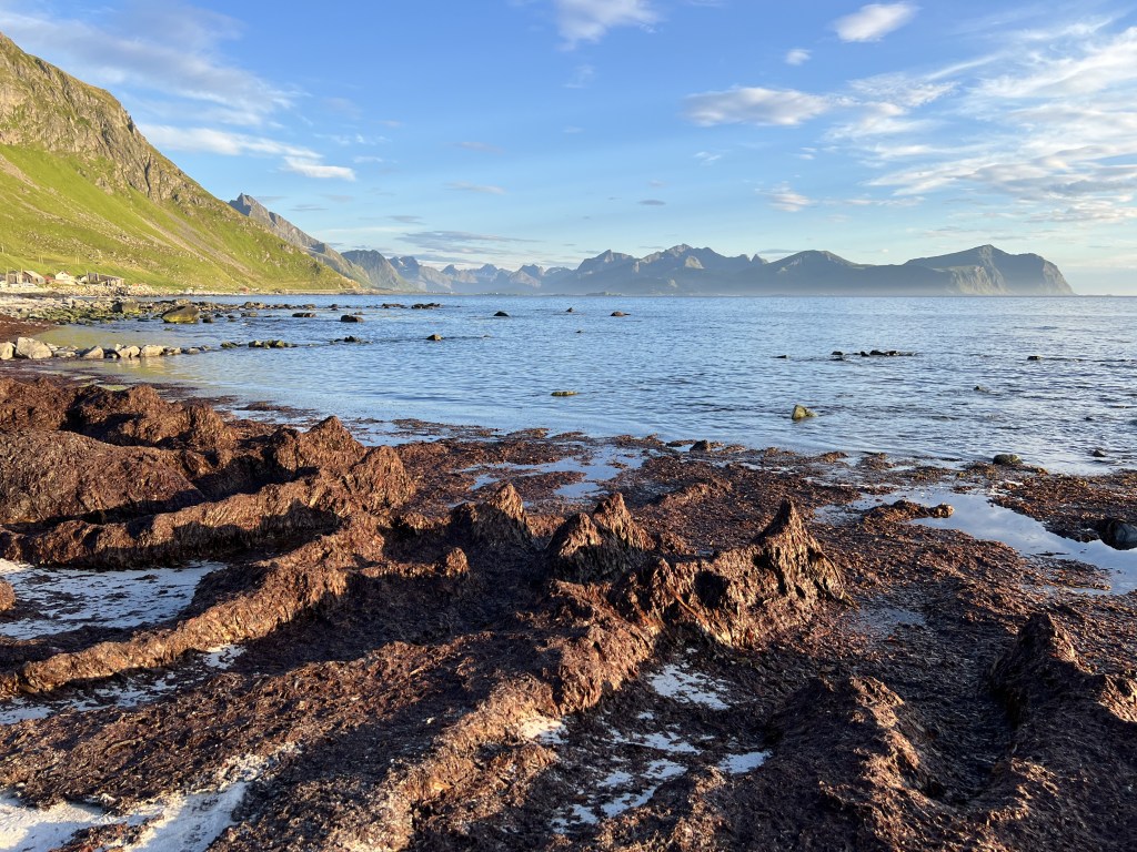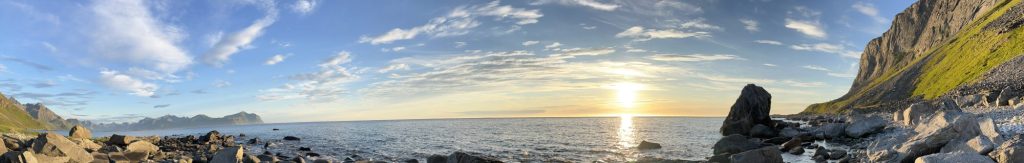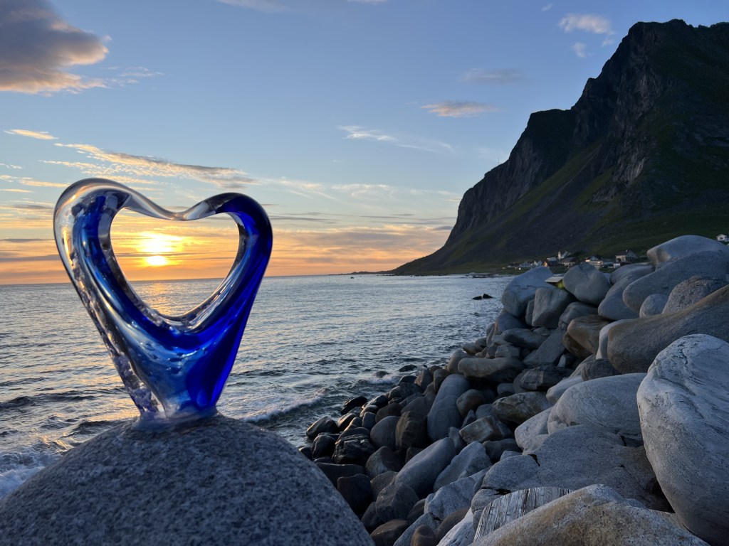 I torsdags gik jeg hjem og sov et par timer efter arbejde – så jeg kunne komme afsted og se midnatssol og stadig være nogenlunde frisk til at møde på arbejde fredag morgen. Jeg kørte en times tid for at komme til Vikten, som jeg havde fået anbefalet af personalet på lægekontoret – og der var da virkelig også smukt. Lofoten er generelt fuld af turister, men der var ikke så mange af dem, der havde fundet vej til Vikten strand. Vikten er kendt for glaskunst, hvilket også kunne ses;-)