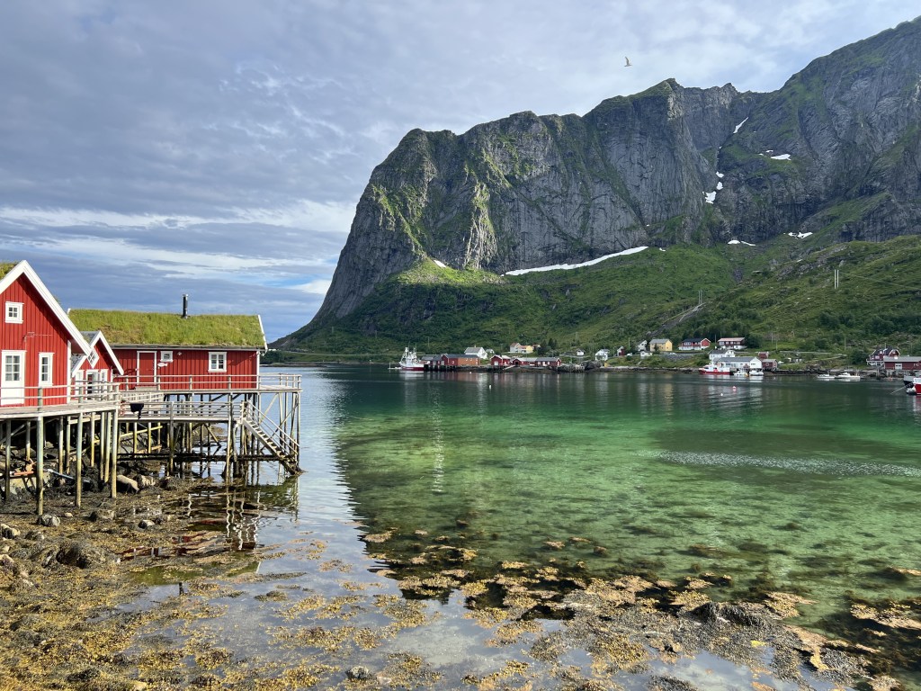 Sakrisøy med de fine gule huse i baggrunden.